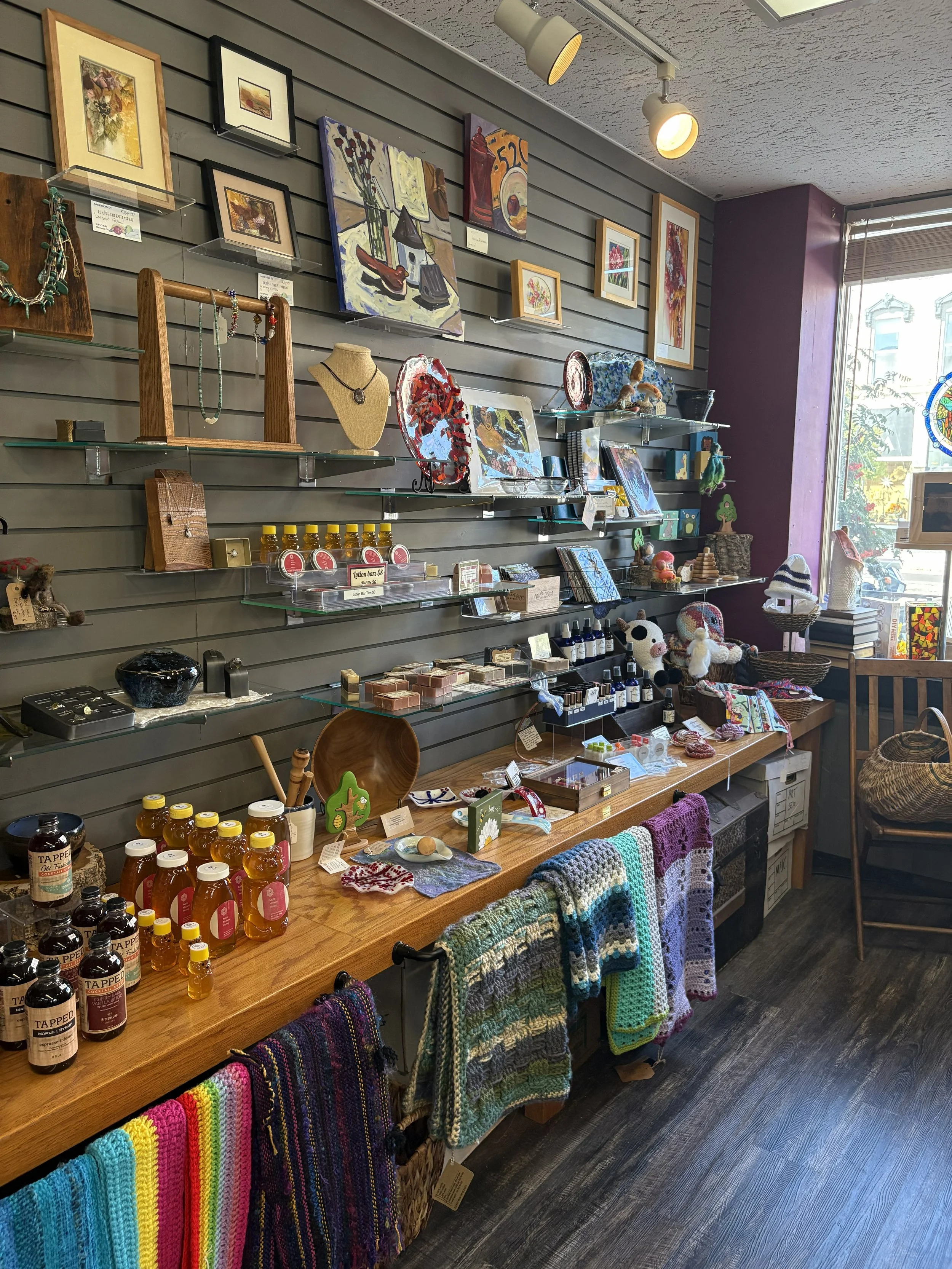 The Book Teller is an independent bookstore and art gallery. Handcrafted by local artists and makers, the selection features stained glass, jewelry, fine art, notecards, pottery, photography, natural body care products, aromatherapy, local honey, toffee, granola, fiber art, and more!