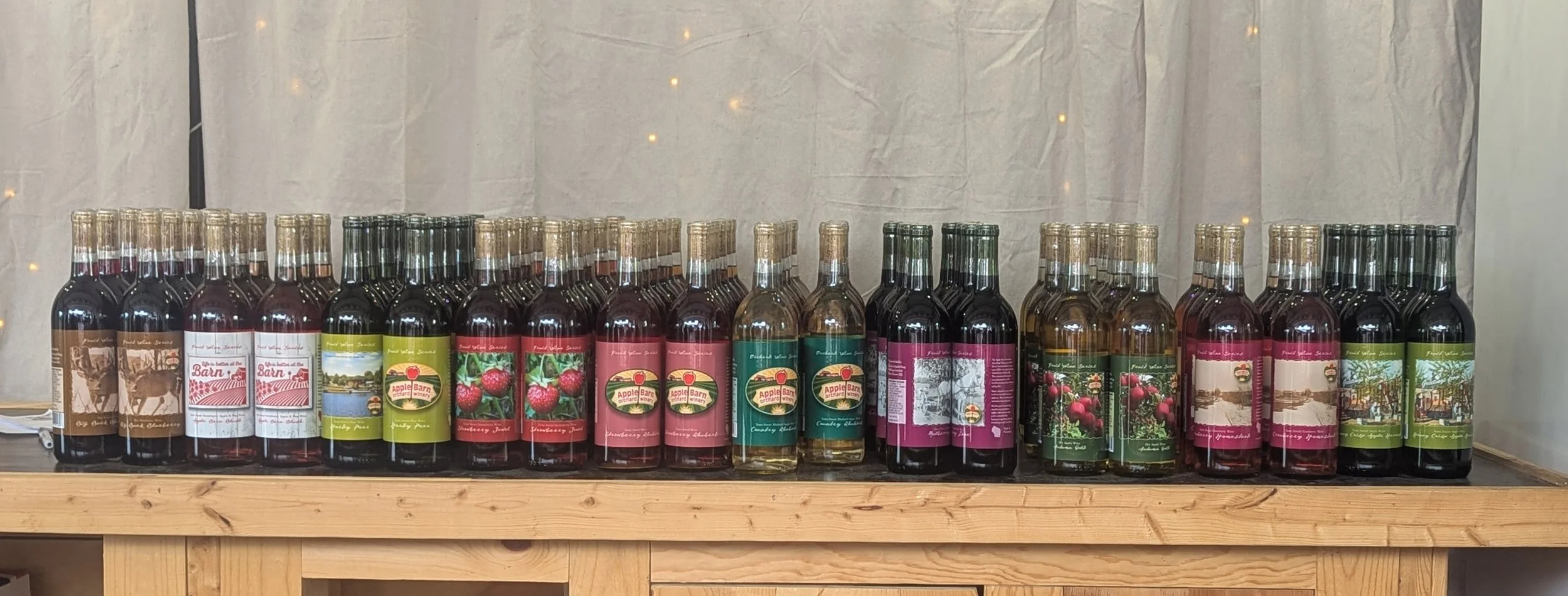 The fruit wine flavors include Honey Crisp Apple Harvest, Hardy Pear, Apple Barn Blush, Raspberry Heritage, Backyard Blueberry, Big Bick Blueberry, Country Rhubarb, and Cranberry Homestead.